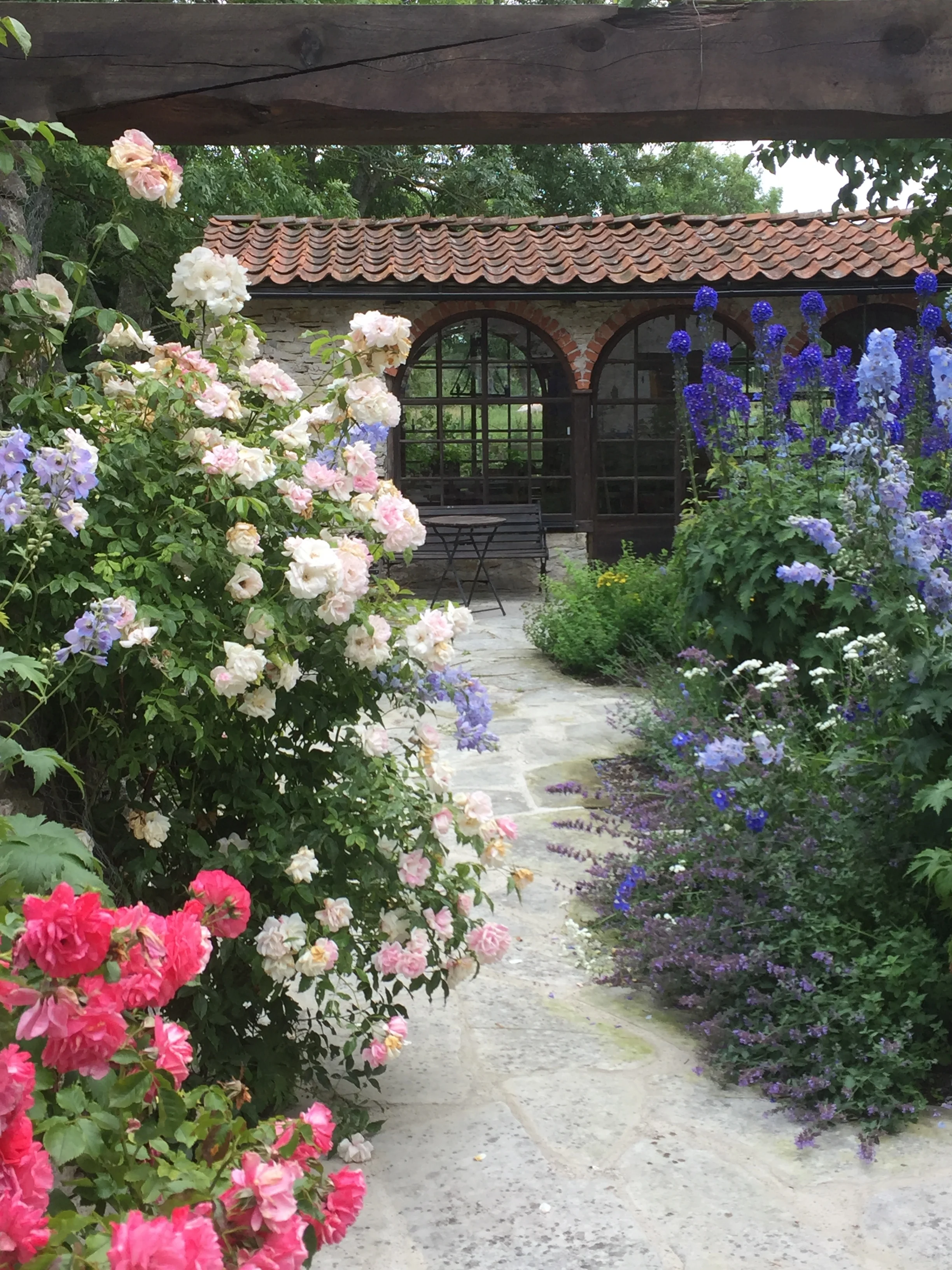 Terassdörr från köket till stenlagd uteplats med kryddträdgård, lusthus uppfört i kalksten och egen inhägnad trädgård.